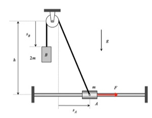 STEP 3 – Kinematics: Review the constrained motion kinematics from Section 1.D of the course lecture book. To this end, you will write down an expression for the length of the cable in terms of sA, sB and constants. Differentiate this expression to relate the speeds of A and B.