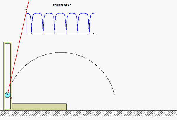 The results of this analysis are shown in the animation below. From this animation, we see that the velocity of the P (shown in BLUE) is always tangent to the path of P. The acceleration (shown in RED) is not quite so simple: it has components both tangent and perpendicular to the path; however, the component perpendicular to the path always points inward on the path. Both of these observations are consistent with what we see in the next lecture when we develop the expressions for velocity and acceleration in terms of their PATH components.