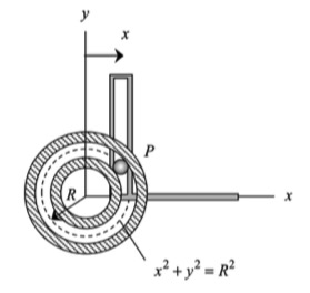 In this problem, the xy-Cartesian components are constrained through the equation of the path of P: x2 + y2 = R2. The x-component of the position is an explicit function of time. Finding the time derivatives of x is done through simple time differentiation of x = b sinωt. The derivatives of y with respect to time is found through the time differentiation of the constraint equation: x2 + y2 = R2. Please review the examples worked out in lecture to assist you in this differentiation.