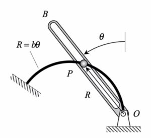 The first time derivative of θ  is given to the the constant ω. Therefore, the second time derivative of θ  is zero. The time derivatives of R are found from direct differentiation of the path equation R = bθ . These results then are used to find the vP and aP in terms of their polar coordinates.