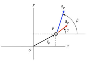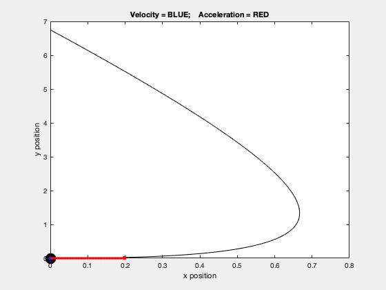 Provided above is an animated GIF of the motion for P. Notice how you can observe from this motion the angles defining the directions of the velocity and acceleration. We see in the animation that the velocity is always tangent to the path, and the acceleration vector tends to point “inward” on the curved path. We will see in the next lecture that these characteristics of the velocity and acceleration vectors are valid regardless of the path.