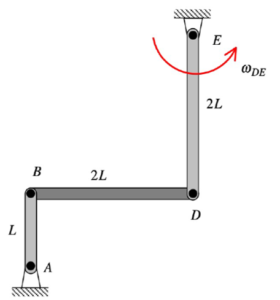 For the sake of creating the above animated GIF, the input link DE has an oscillating (non-constant) rotation rate. However, when link DE is vertical, alpha_DE is zero. Therefore, for the instant at which you are asked to find angular velocities and angular accelerations, the animation corresponds to the problem statement.