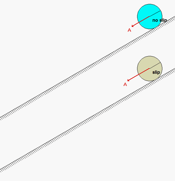 Can you see the difference in rotational motion of the sphere between the no-slip and slipping cases?