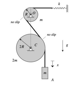 Note that the speed of every point on the cable is the same since the cable does not stretch or go slack. Use this to relate the angular accelerations of the pulley and disk to the acceleration of the block. As confirmed by the animation above, the angular rotations of the disk and the pulley are NOT the same, in either magnitude or direction. Also, since the cable does not stretch, the amount of stretch in the spring is the same as the displacement of the block, x.
