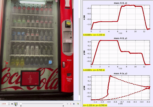 Shown below is a video recording of the motion of the vending machine carriage as it moves through the different phases of its motion. Tracking software was used to capture the xy-components of position for the carriage. From this data,  x(t) vs. t, y(t) vs. t and y(t) vs. x(t) plots are constructed and shown to the right of this video. The y(t) vs. x(t) plot shows the path taken by the carriage during its motion.
