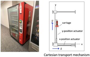 A common type of machine for the vending of bottled drinks is the Cartesian-drive machine shown below. Here, a carriage for the drink bottles moves from a starting point on the lower left side of the machine to pick up the drink bottle, with the carriage then delivering the bottle to a pick-up location for the bottle and a subsequent return of the carriage to its original starting location, readying for the next sale. The position of the carriage is set through linear actuation along two mutually perpendicular xy-axes, as shown below right.
