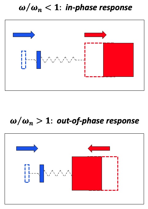 - For near the “resonant” frequency (ω = ωn), the response amplitude becomes large (in theory, becomes infinite) and the response changes from “in-phase” to “out-of-phase” with respect to the forcing.