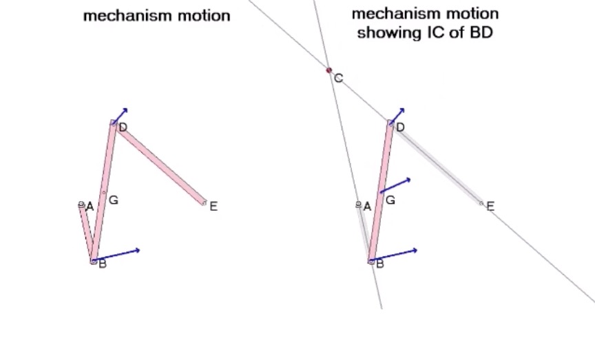 Consider the mechanism shown below made up of moveable links AB, BD and DE. Link AB is rotating CCW at a constant rate. Point C is the center of rotation for BD, where point C is at the intersection of perpendiculars to the velocities of points B and D. Therefore, the velocity of any point on BD is perpendicular to the line connecting that point with C, and the speed of that point is proportional to the distance of that point from C. Since the location of the rotation center C moves with the mechanism motion, it is known as the “instant center” of rotation for BD. You can observe this in the video shown below.