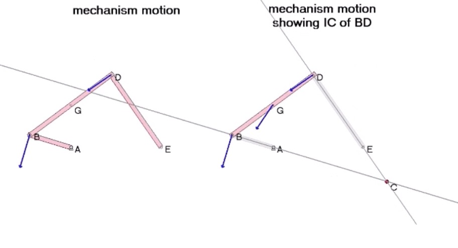When link AB and DE are parallel (positions for which the instant center C is at ∞), the angular velocity of BD is zero – can you see this in the animation? Shown below are two freeze-frames, one with the IC for BD below E and one with the IC for BD above D. In each freeze-frame, can you see that the direction of velocities for all points on BD are perpendicular to a line connecting that point to the IC (point C)?