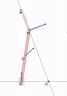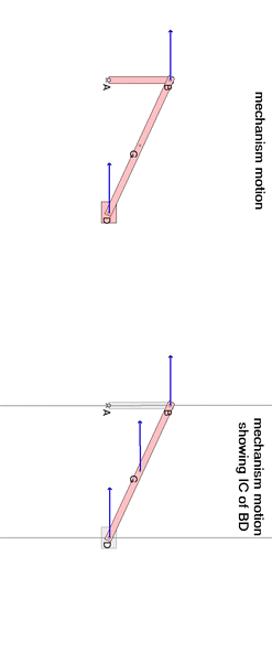 Consider the mechanism shown below made up of moveable links AB, BD and slider D. Link AB is rotating CCW at a constant rate. Point C is the center of rotation for BD, where point C is at the intersection of perpendiculars to the velocities of points B and D. Therefore, the velocity of any point on BD is perpendicular to the line connecting that point with C, and the speed of that point is proportional to the distance of that point from C. Since the location of the rotation center C moves with the mechanism motion, it is known as the “instant center” of rotation for BD. You can observe this in the video shown below.