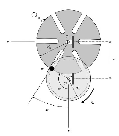 A pin P is attached to the input drive that is allowed to slide within radial slots in the output shaft gear as the two drives mesh. During the time period when P is in contact with the slots on the output drive, the rotation of the input drive produces continuous rotation of the output drive. During the remainder of a single rotation of the input drive, the output drive is stationary. Therefore, over one full rotation of the input drive, the output drive experiences intermittent rotation.