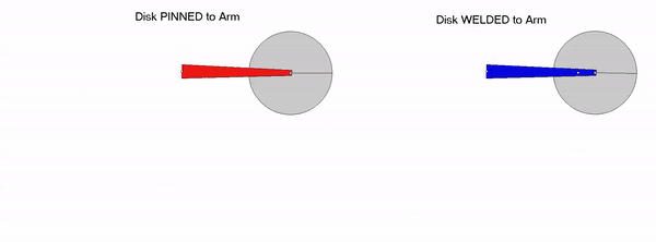 CONCLUSION: For a given angular orientation for OC, OC will be rotating more slowly in the welded joint case than for the pinned connection case. Can you see this in the following animation of the motion simulation for these two systems?
