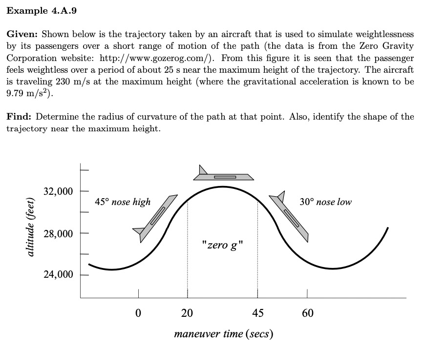 Consider Example 4.A.9 from the course lecture book. This problem deals with the NASA near-weightless training aircraft exercises for simulating the weightless environment for astronauts. (Due to the experiences of those in training, these training aircraft are nicknamed “Vomit Comets”.)