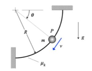 As P moves long the rough circular arc guide, a sliding friction force acts on P, with this friction force always opposing the motion of P. You can see this in the animation above, where the friction force always point in the direction opposite to the velocity of P.