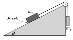 Recall when drawing a free body diagram for a system that slips when need to know the correct direction of the friction force. Consider two cases for the system shown where we change the mass of block B. In the top animation below, block B is “light”, whereas for the bottom animation, block B is heavy. The motion of the system is as expected. However, how do we know which situation that we have for the mass values given in this problem: is our block B heavy or light? Importantly, does the friction force on block A point up the incline or down the incline?