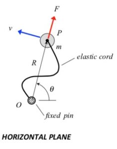 Write down the angular momentum expression for P about O: HO = m rA/O x vA. Looking at your FBD, is angular momentum about O conserved? Note that you are asked to find the velocity of P – this velocity vector has two components. From where do you get the second equation? Consider the work-energy equation.