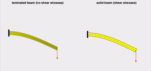 As we have seen before, the presence of a shear stress on the x-faces says that there will also be shear stress components on the y-faces of the stress element. What if we create a beam that reduces this shear stress component on the y-faces by making the beam of thin laminae not joined together? In this case, as the beam deflects, the beam cross sections do NOT remain perpendicular to the neutral plane, as see in the animation below.