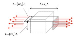 The member shows a tensile normal component of strain in the axial x-direction and contractive normal strains in the transverse directions (due to the Poisson’s effect). The rod does NOT experience shear strains on the xyz faces of a stress element. A square painted on the side of the rod will retain its rectangular shape as a result of this strain, as shown with the red square below. Only the dimensions of the rectangle change.