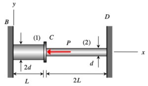 - Compatibility equations: Write down the elongation/displacement compatibility equation relating the elongations of rods (1) and (2).