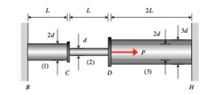 3. Compatibility – Starting from the left end, add up the elongations for the three elements. This sum equals the displacement of end H, uH. What is uH in this case?