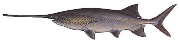 Slate-colored above, lighter below; greatly elongated snout, long gill covers and a shark-like mouth; scaleless with a skeleton of cartilage |
