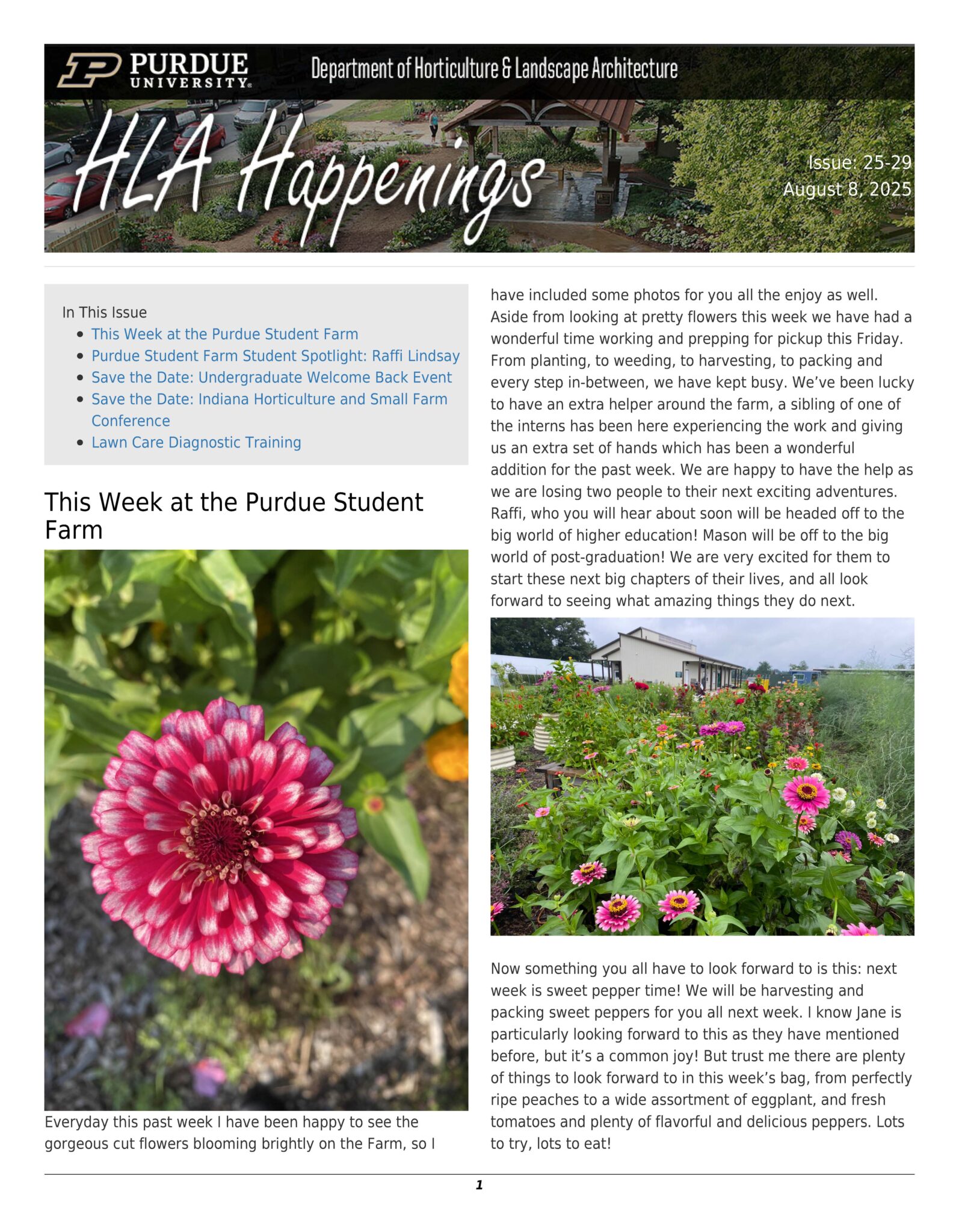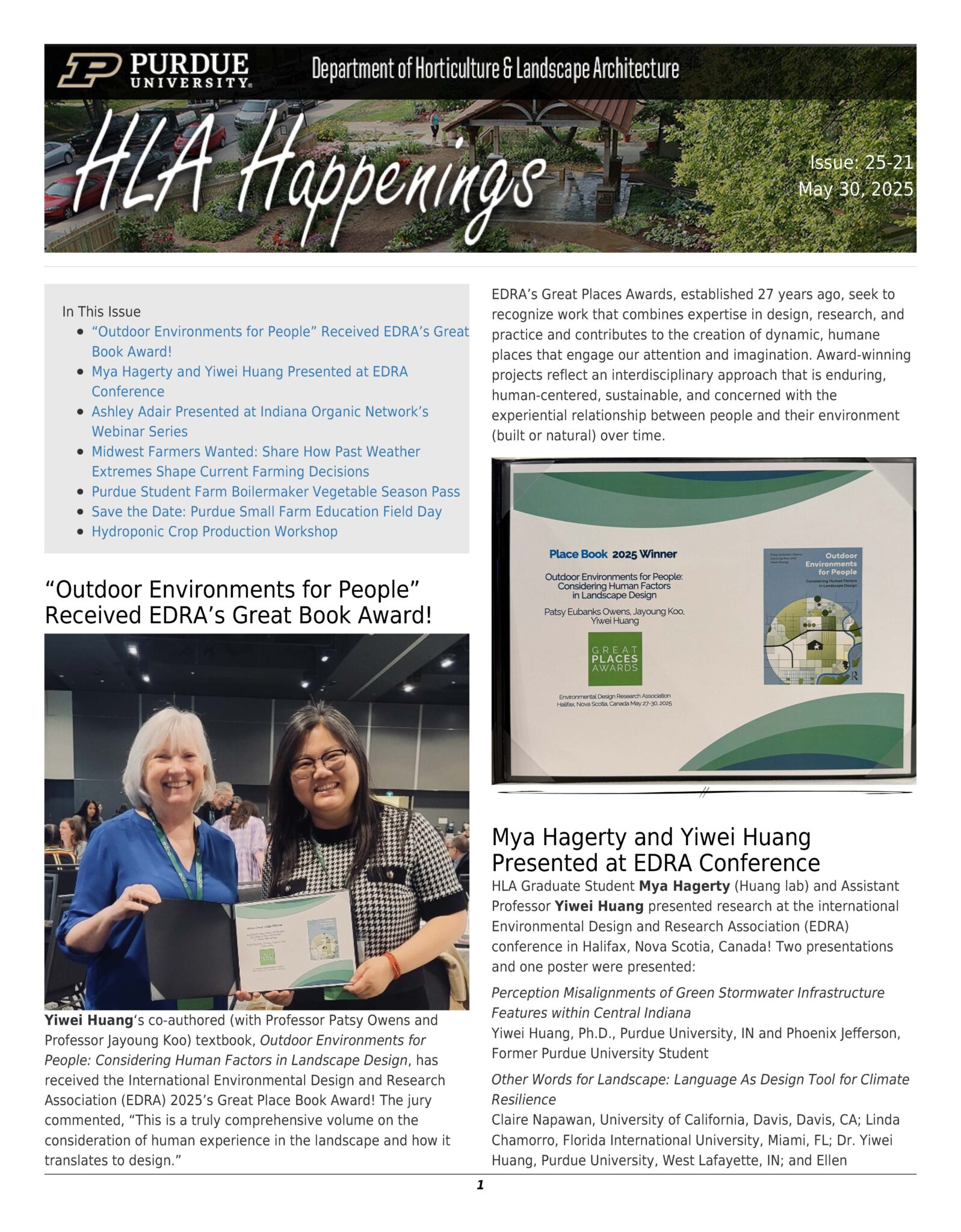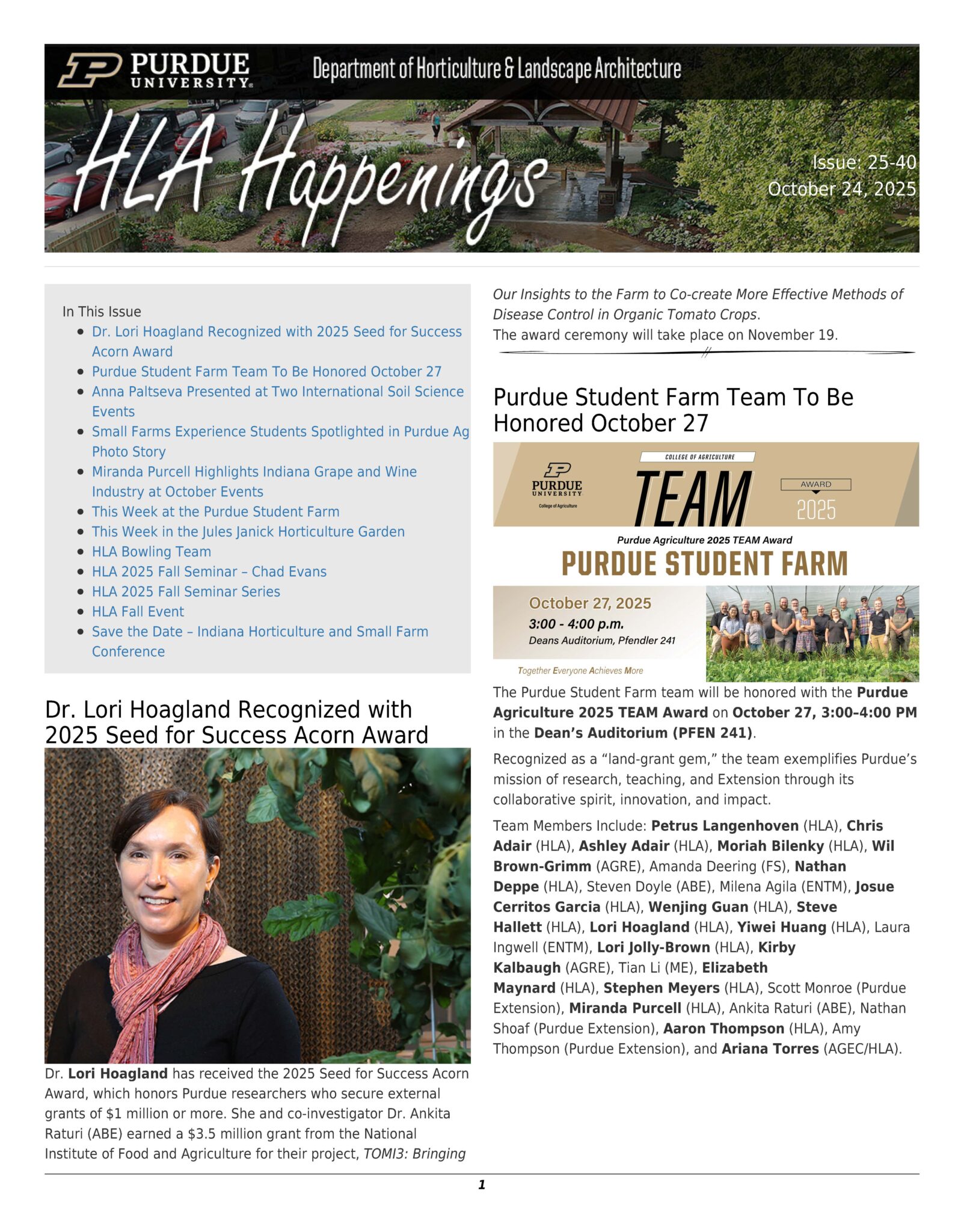 HLA Happenings - Horticulture & Landscape Architecture, 625 Agriculture Mall, West Lafayette, IN 47907© 2025 Purdue University | An equal access/equal opportunity university | Copyright Complaints | Maintained by HLA Happenings