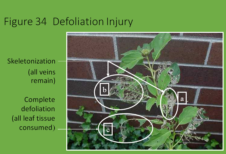 When insects and mites feed on plants they injure them. When this injury harms plant health, or makes a client dissatisfied with plant appearance, the plant is damaged. This concept is critical to the successful management of client properties. Detection of a single insect does not, by itself justify treatment because it is not likely to cause enough injury to damage the tree. For example, consider a 40′ tall oak tree with approximately 100,000 leaves. Loss of 10 leaves to a single caterpillar is not likely to harm plant health. More importantly, your clients are not likely to notice it. Most people require about 10%, or 10,000 leaves to be missing for its appearance to be unacceptable. At this level, plant health is not likely to be affected. Other factors, such as whether the caterpillars are dropping their excrement on your client’s picnic table should also be part of the assessment process