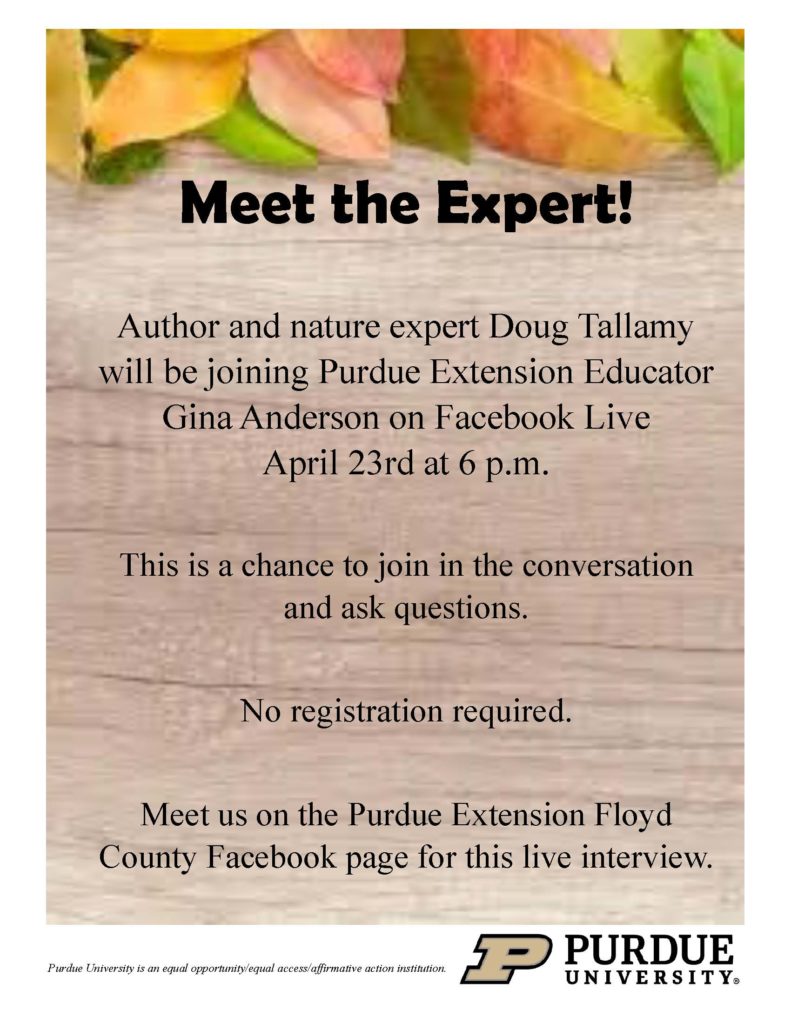 Author and nature expert Doug Tallamy will be joining Purdue Extension Educator Gina Anderson on Facebook Live April 23rd at 6 p.m.