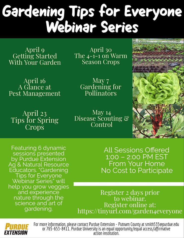 Featuring 6 dynamic sessions presented by Purdue Extension Ag & Natural Resource Educators. “Gardening Tips for Everyone Webinar Series” will help you grow veggies and experience nature through the science and art of gardening.