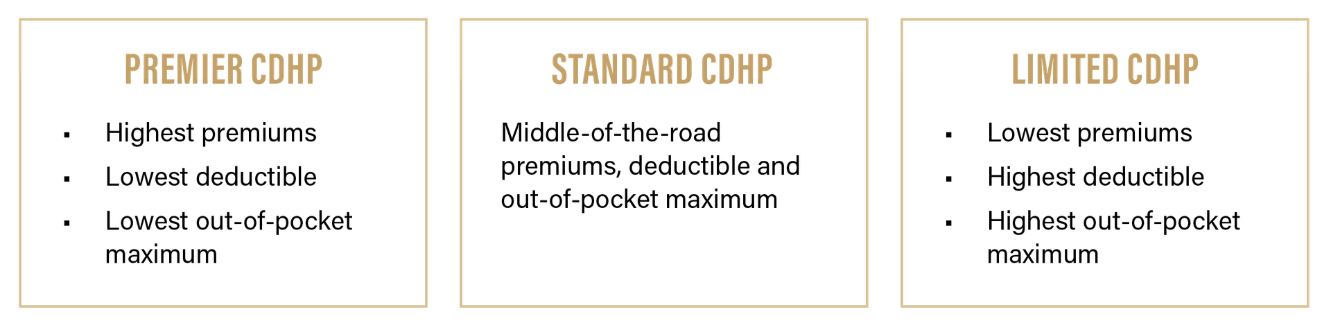 Your medical plan options for 2022 remain the same. You have a choice from three Consumer Driven Health Plans, or CDHPs. |
