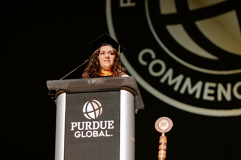Lauren Castrinos Bradford, an alumna of Purdue Global, delivers the keynote address on Saturday (May 6) during commencement ceremonies in West Lafayette, Indiana. (Purdue Global photo/Kelsey Lefever)