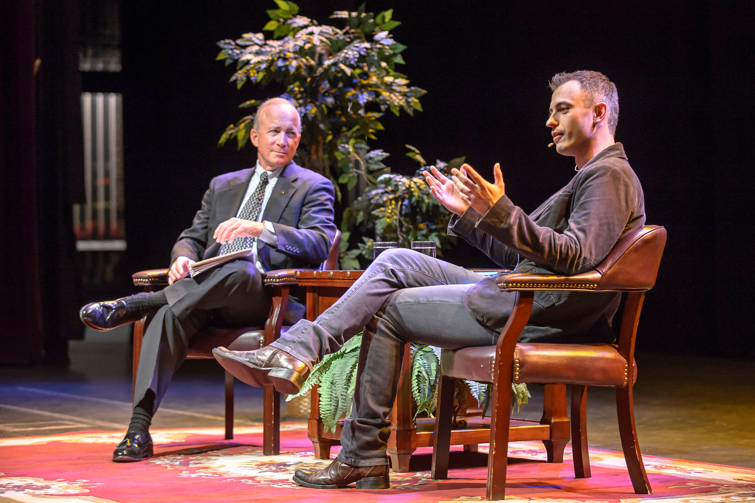 President Mitch Daniels and Paul Eremenko, who currently heads Project Ara in Google's Advanced Technology & Projects (ATAP) organization, discuss innovation at Google, the Defense Advanced Research Projects Agency (DARPA) and elsewhere during the second lecture of the Fall 2014 Presidential Lecture Series. The lecture, titled "Models of Innovation," was held Wednesday (Oct. 8) in Stewart Center's Loeb Playhouse.