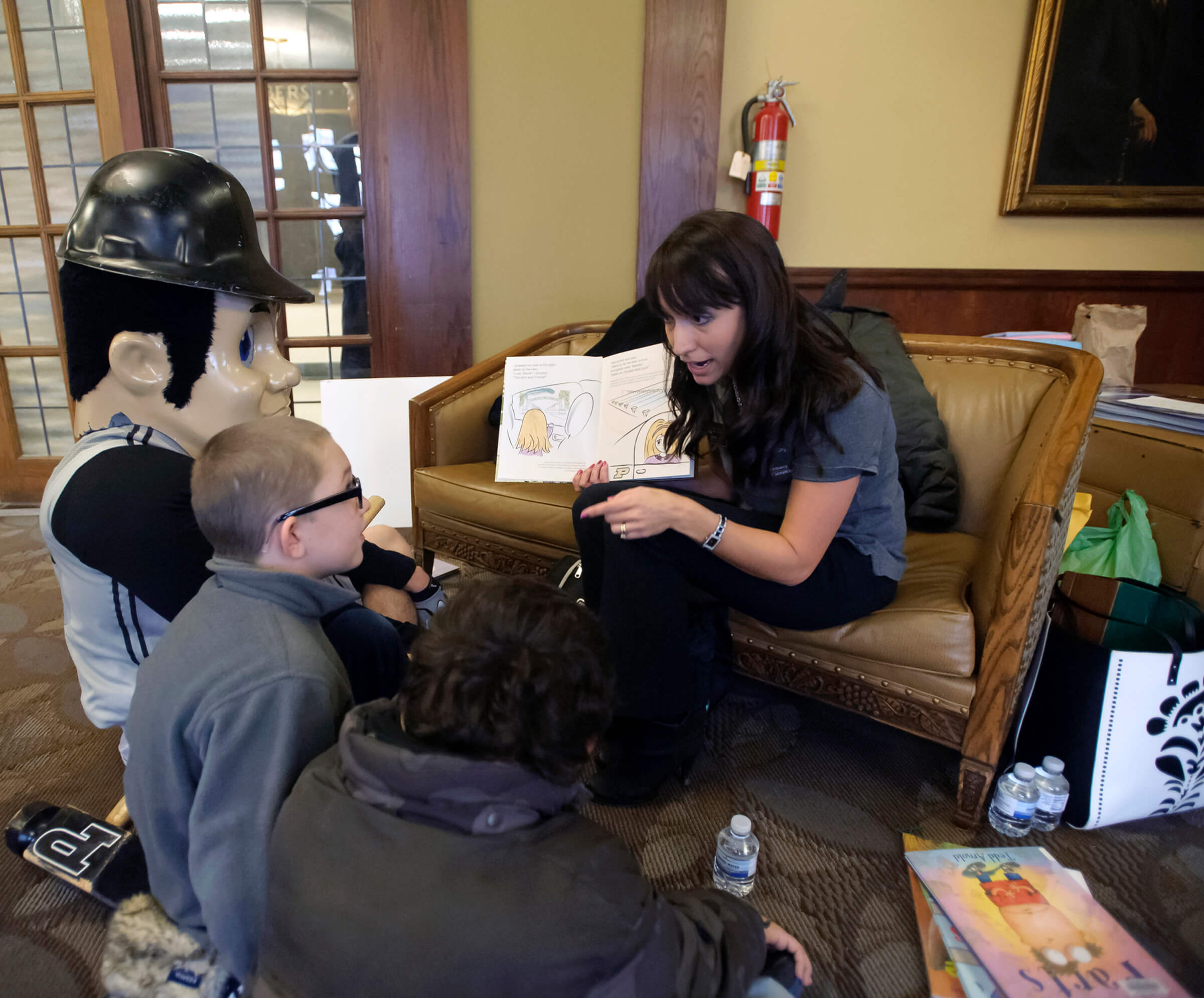 Brooke Linn, author of "BoilerMAKER: Discovering Purdue University," reads to local children during an event organized by the Barbara Cook Chapter of Mortar Board on Wednesday (Nov. 12) in Purdue Memorial Union. (Purdue University photo/Matt Thomas)