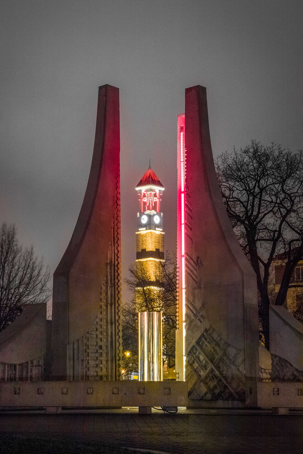 Water sculpture, Bell Tower lit in tribute