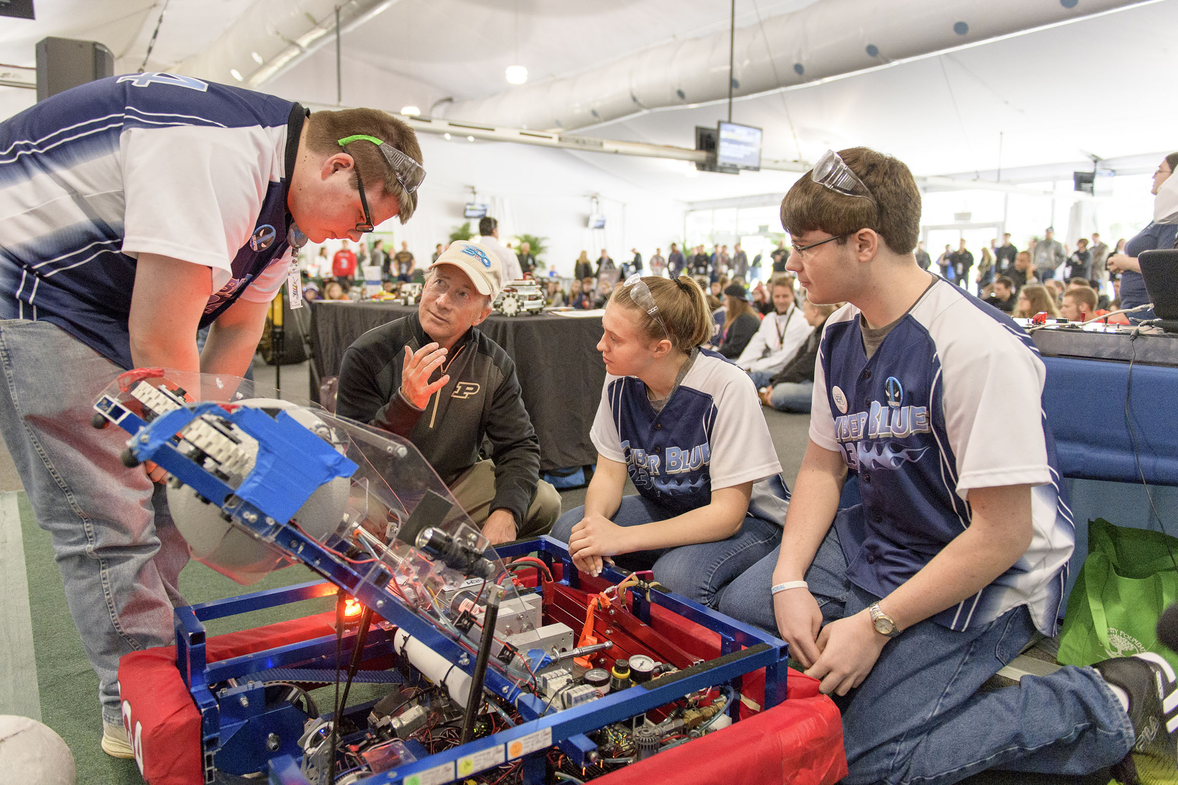 President Mitch Daniels learns about a robot created by a group of high school students at the MSTEM Student Fair on May 17 at the Indianapolis Motor Speedway. (Purdue University photo/John Underwood) |