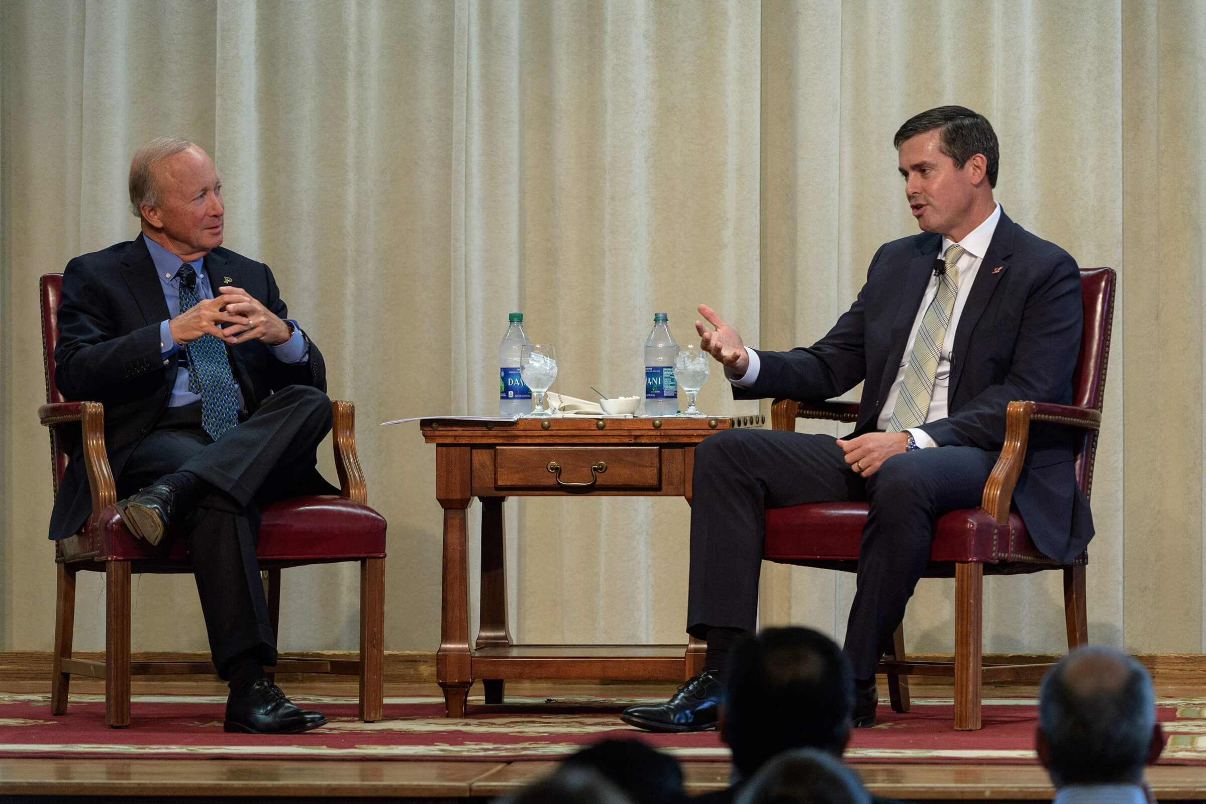 Purdue President Mitch Daniels and Eli Lilly and Co. chairman and CEO Dave Ricks take part in a fireside chat during Lilly Day at Purdue on Aug. 30. (Purdue University photo/John Underwood)