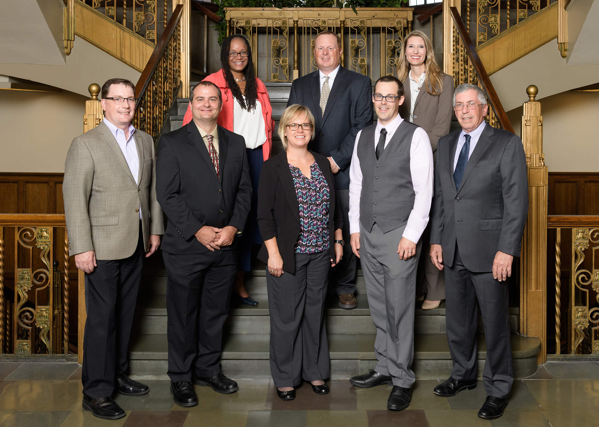 CMD class of 2019: First row, left to right: Denny Darrow, vice president for human resources; Chris Teague; Tonya Agnew; Bryan Gutridge; Bill Sullivan, treasurer and chief financial officer. Second row: Zenephia Evans, Ben Terhune, Michelle Bates. (Purdue University photo/John Underwood)