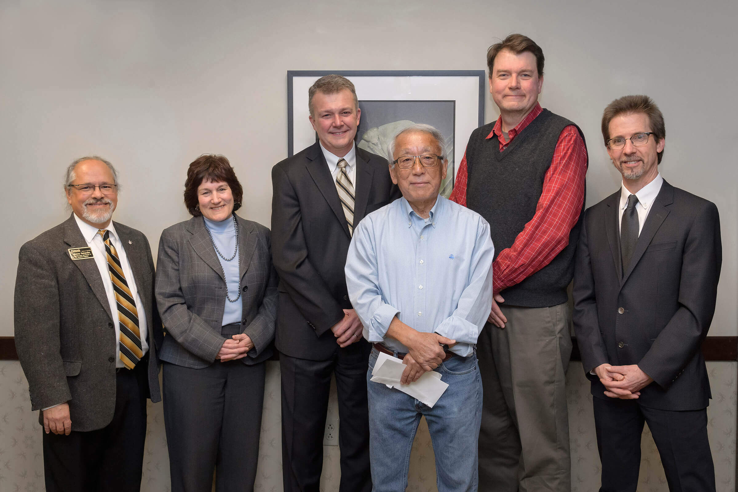 (From left) Marcos Fernandez, associate dean and director of academic programs; Karen Plaut, interim dean of the College of Agriculture; Jay Akridge, provost and executive vice president for academic affairs and diversity; Christian Oseto, professor of entomology; Stephen Cameron, head and professor of entomology; and Peter Hollenbeck, vice provost for faculty affairs. (Purdue University photo/Rebecca Wilcox)
