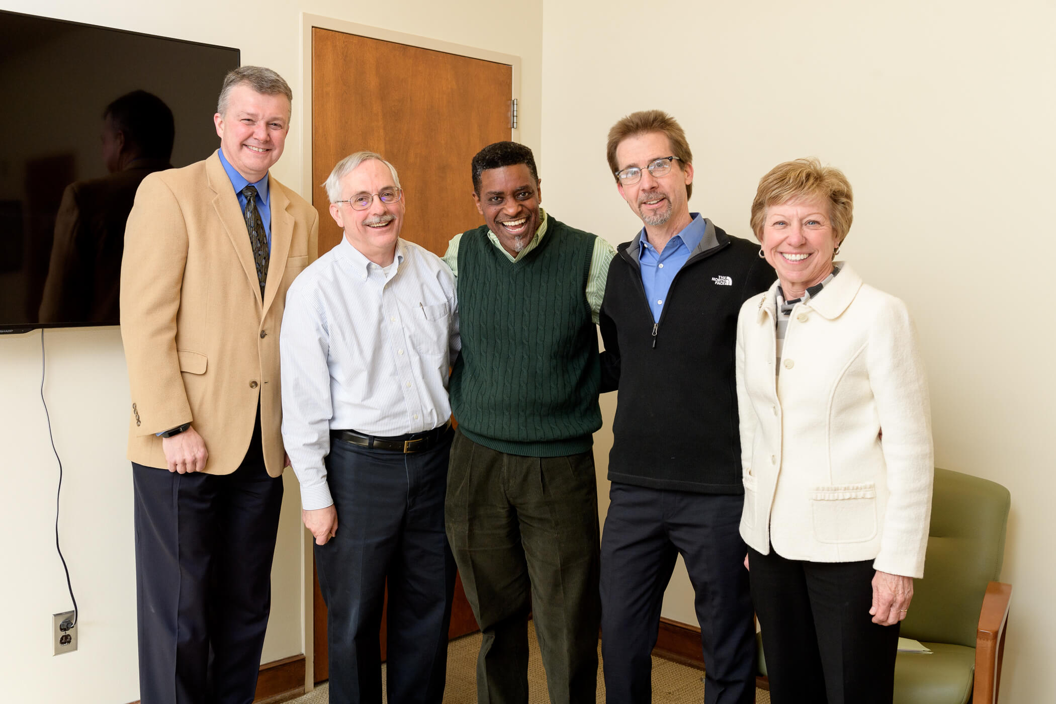 (From left) Jay Akridge, provost and executive vice president for academic affairs and diversity; Thomas Berndt, senior associate dean for academic affairs and administration, College of Health and Human Sciences; David Rollock, professor of psychological sciences; Peter Hollenbeck, vice provost for faculty affairs; and Chris Ladisch, dean of the College of Health and Human Sciences. (Purdue University photo/John Underwood)