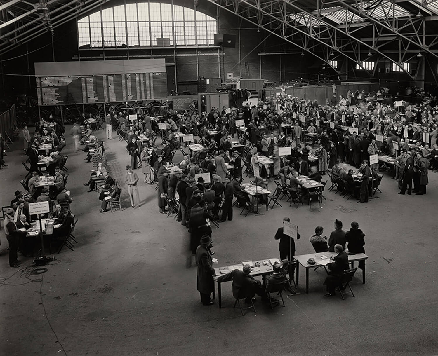 This image shows registration in the Armory, circa 1930s, with a large schedule board listing class sections along the back wall.