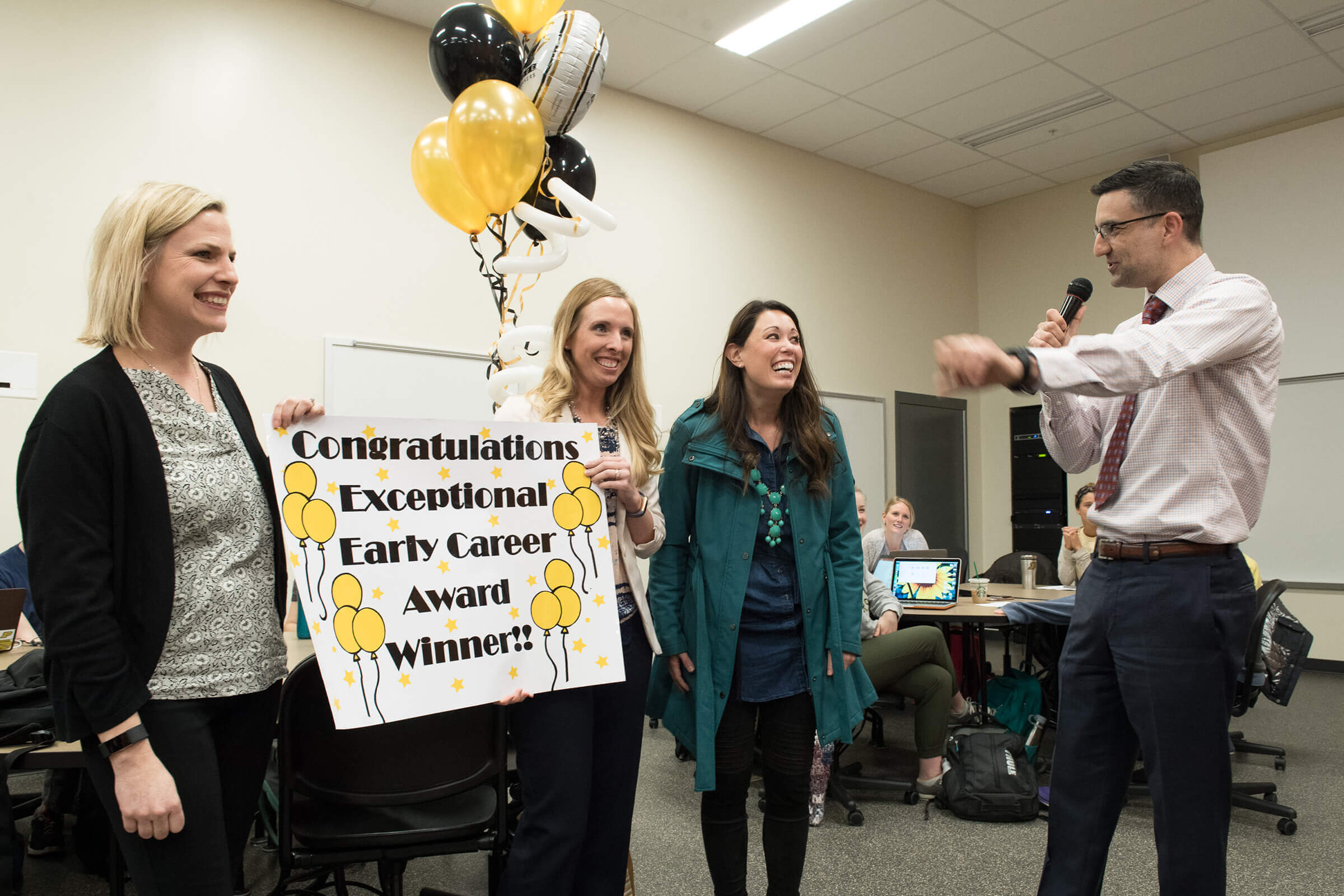 Becky Walters (third from left), clinical assistant professor in the School of Nursing, received the Exceptional Early Career Award on Tuesday. Among those on hand (from left) were Diane Hountz and Kristen Kirby, also clinical assistant professors of nursing; and David Nelson, associate director of the Center for Instructional Excellence. (Purdue University photo/John Underwood)