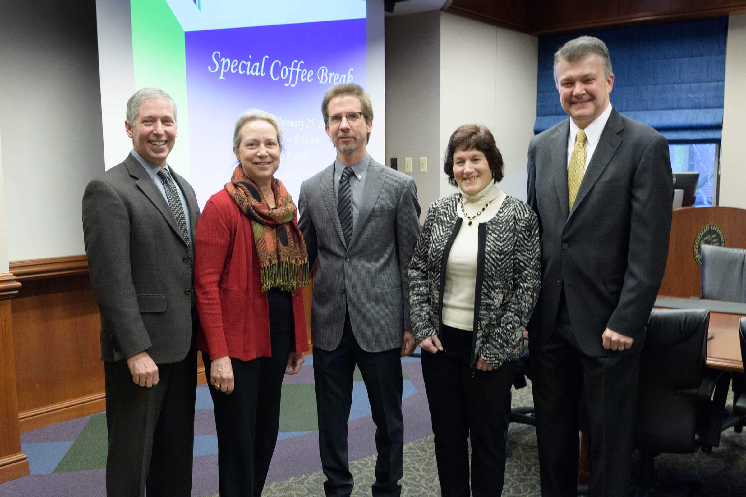 (From left) Brian Farkas, head and professor food science; Suzanne Nielsen, professor of food science; Peter Hollenbeck, vice provost for faculty affairs; Karen Plaut, interim dean of the College of Agriculture; and Jay Akridge, provost and executive vice president for academic affairs and diversity. (Purdue University photo/John Underwood)