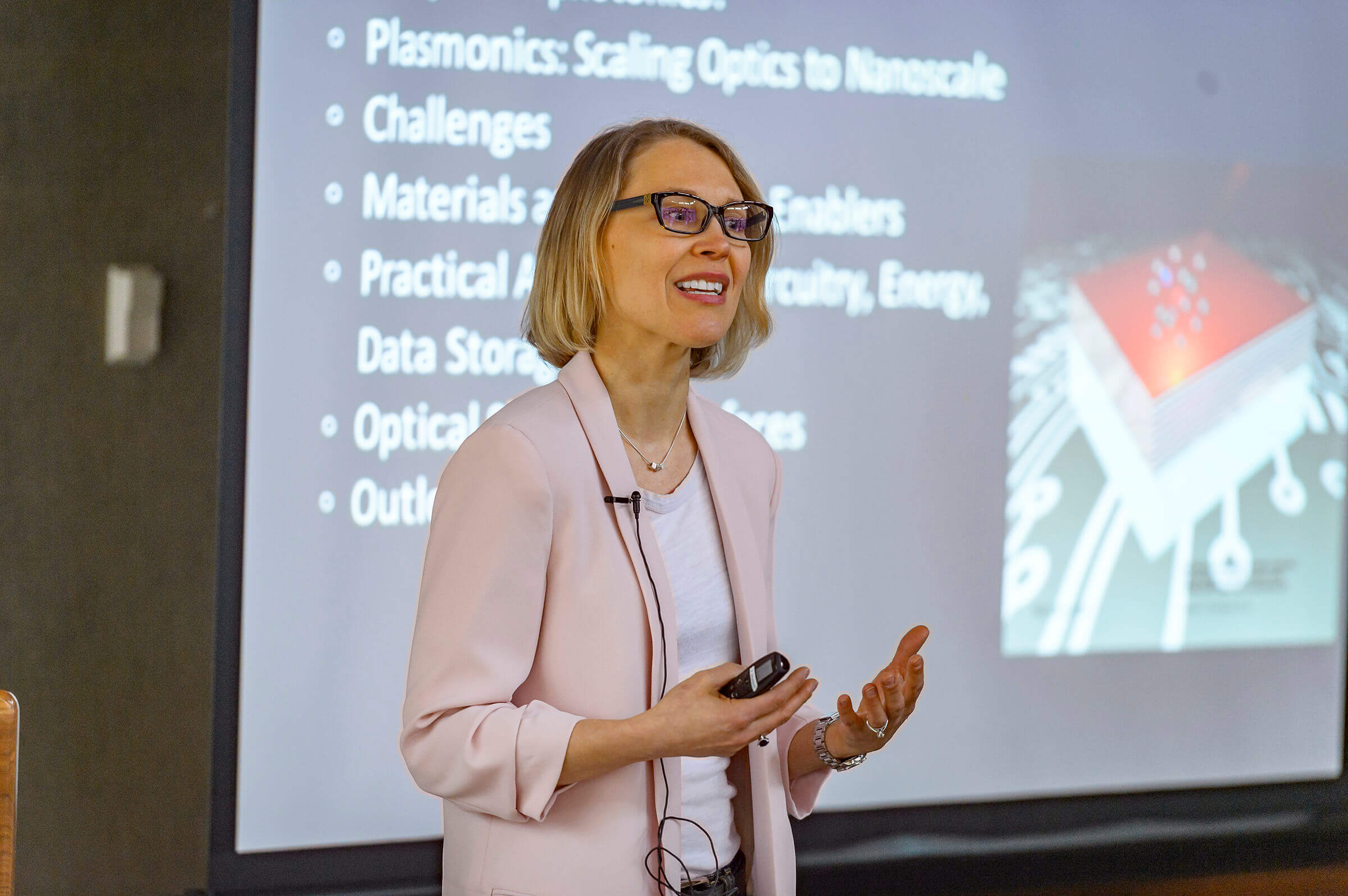 Alexandra Boltasseva, professor of electrical and computer engineering, on Tuesday (April 24) gave her presentation on "Catching Light Rays: Making Light Work at the Nanoscale for Faster Communication, Denser Data Storage, Energy and Medical Applications" as part of the President's Colloquia series.