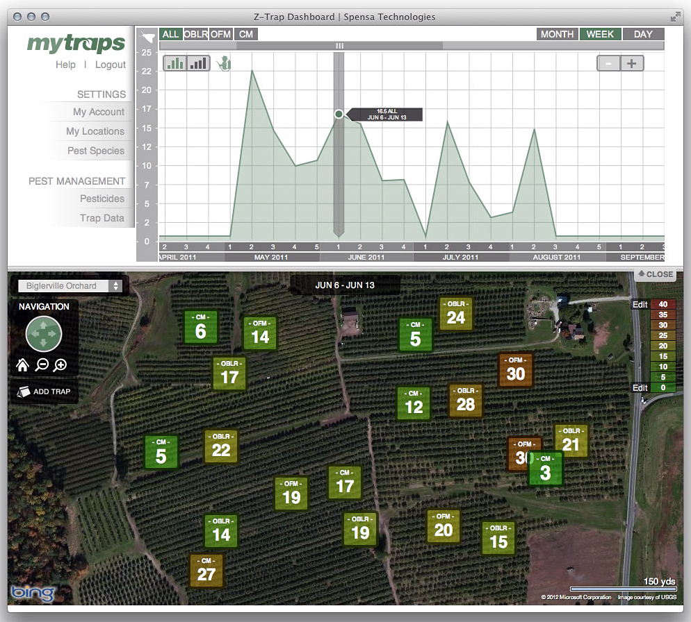 "As an online subscription service, MyTraps.com maintains insect data in a fast, efficient manner that not only shows the current insect population, but also historical data that can help growers anticipate future growing seasons," Park said. "Another important feature is that the program provides aerial field images taken from satellite cameras and places the insect data over the image of the fields so growers can see the insect population data on photographs of the fields."