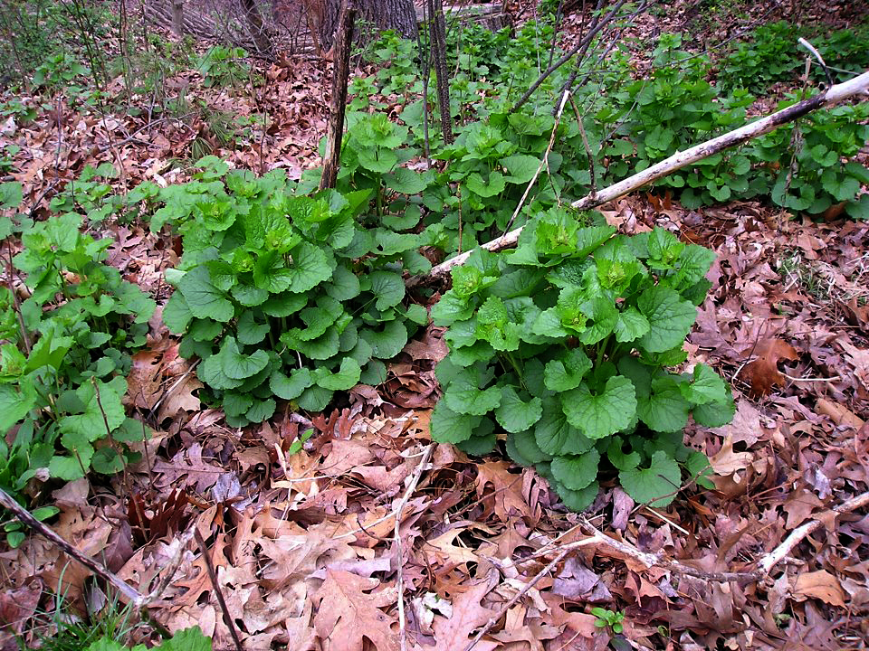 of garlic mustard spread just a few feet from a house in Indiana with a wooded