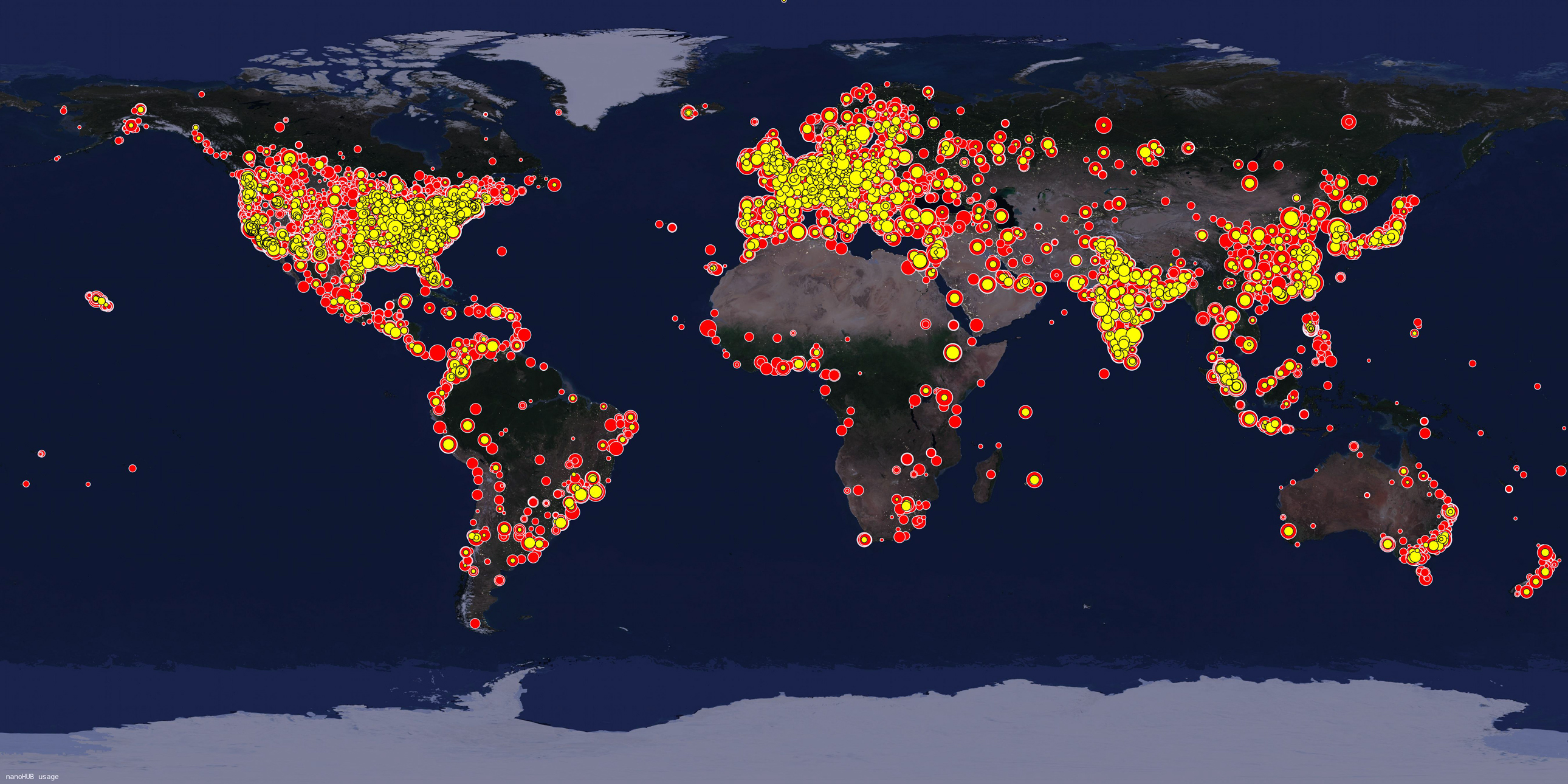Nearly 250,000 users participate in nanoHUB, an online meeting place for simulation, research, collaboration, teaching, learning and publishing. The red dots indicate users of online lectures, seminars, courses and teaching materials, while yellow dots indicate simulation users. (Photo illustration by Office of the Vice President for Research)