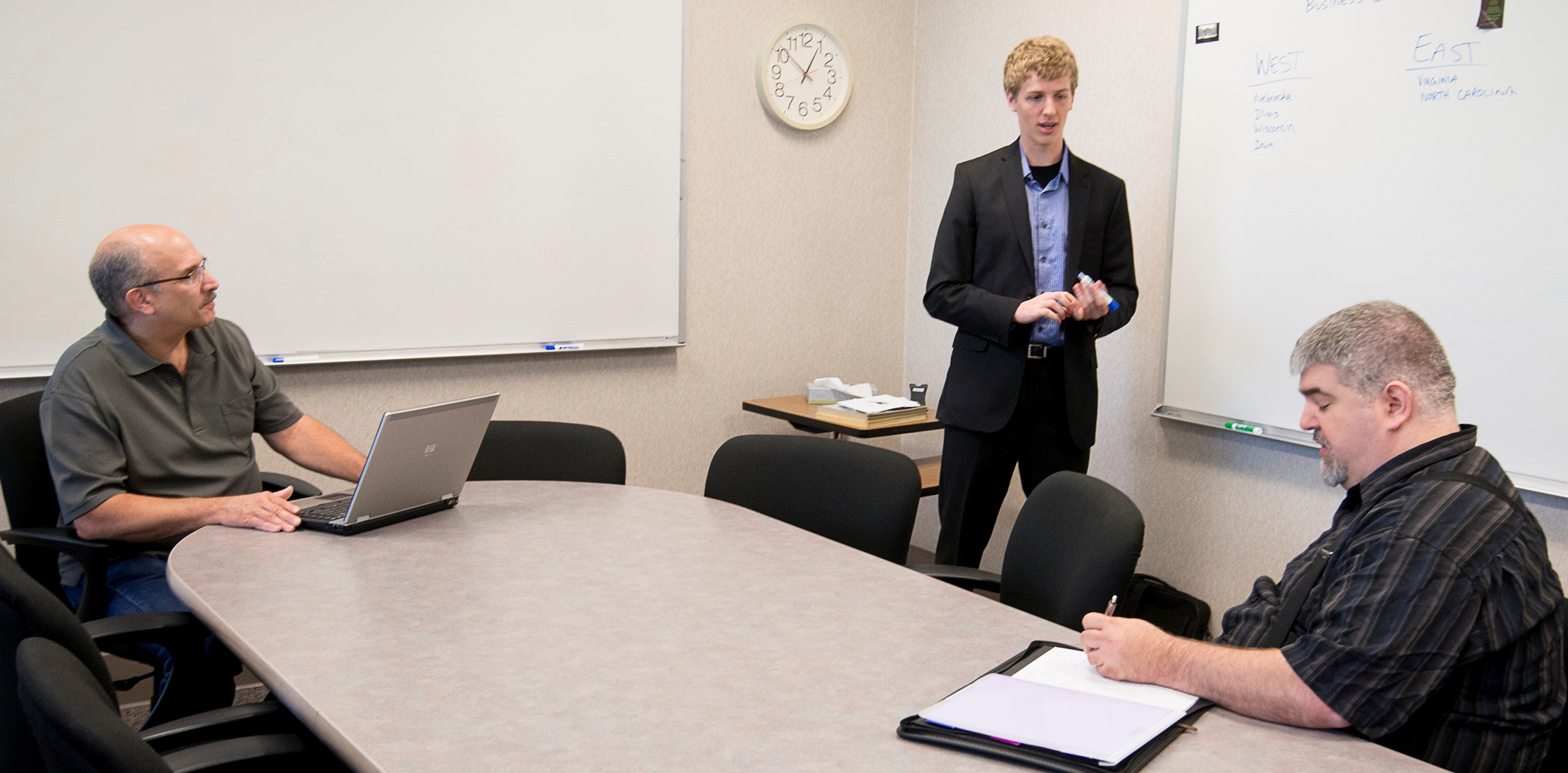 Entrepreneurs and Purdue Research Foundation staff use a conference room in the Discovery Park Partners facility in West Lafayette. The 10,000-square-foot facility will provide space for industry and Purdue research partnerships, student entrepreneurial activities and startup company offices. (Purdue Research Foundation photo) |