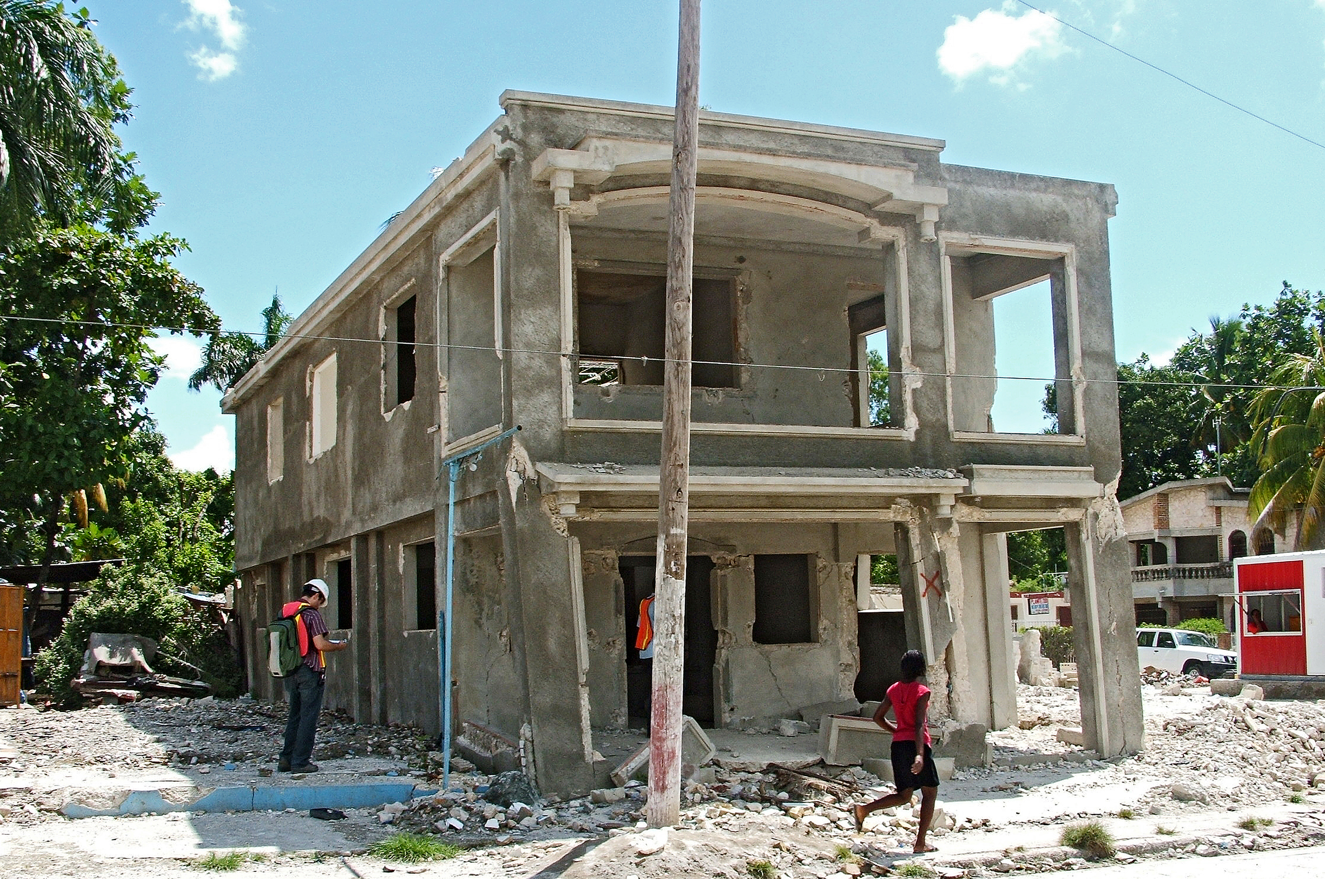 Santiago Pujol, at far left, a Purdue associate professor of civil engineering, surveys a private residence damaged in a Haiti earthquake. The building was among 170 surveyed by civil engineers studying the effects of the January 2010 earthquake. Such photos and research-related information regarding earthquakes are part of a database maintained and serviced by the National Science Foundation's George E. Brown Jr. Network for Earthquake Engineering Simulation (NEES), based at Purdue. (Purdue University photo/Kari T. Nasi) |