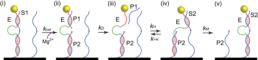 The core is made of an enzyme that cleaves off part of a strand of RNA. After cleavage, the upper DNA arm moves forward, binding with the next strand of RNA, and then the rest of the DNA follows. The process repeats until reaching the end of the nanotube track.