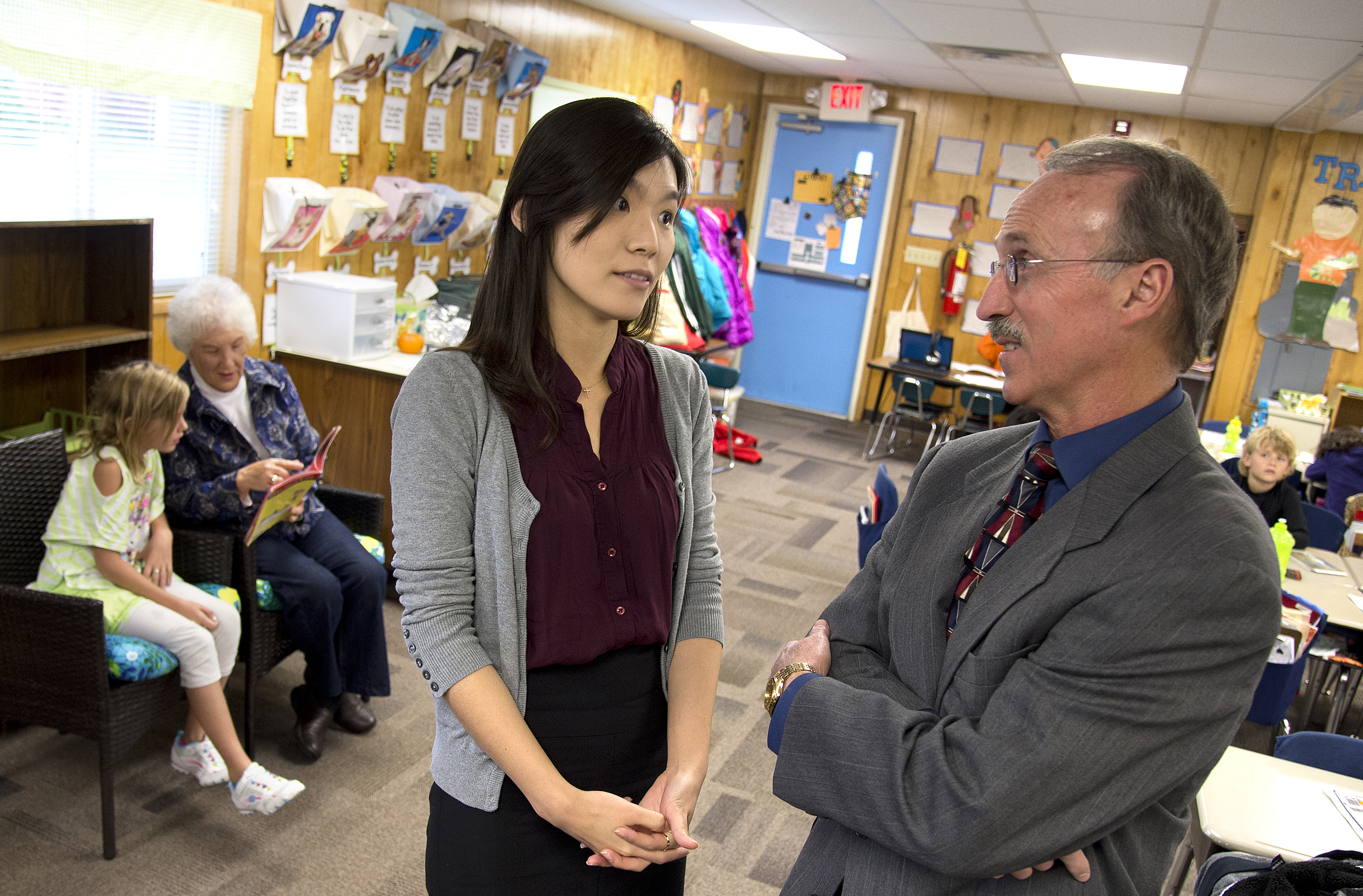 Adults 70 or older who regularly volunteer are in better physical health than those just a few years younger, according to new research from Purdue doctoral student Seoyoun Kim, from left, and distinguished professor of sociology Kenneth F. Ferraro. The sociologists found that older adults, ages 70-85, who regularly volunteered have younger biological profiles than those ages 58-69 who infrequently volunteer. Their research is published in The Gerontologist. Pictured in the background is Read to Succeed volunteer Janice Hooper with a Burnett Creek Elementary School student. (Purdue University photo/Mark Simons) |
